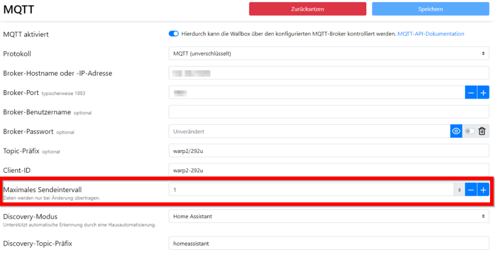 7. Danke Euch. Firmware habe ich eingespielt. Im Webinterface sehe ich dennoch das MQTT Sendeintervall auf 1s. Ist das der Timeout auf den ihr in Eurer letzten Nachricht verweist? Soll ich diesen auf 10s stellen? Ansonsten teste ich's gleich mal ein bisschen und schließe das Fahrzeug an, ab und starte ein paar Ladevorgänge. Mal schauen.