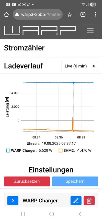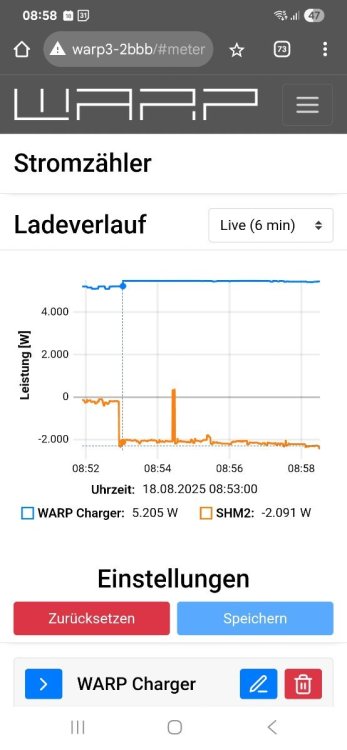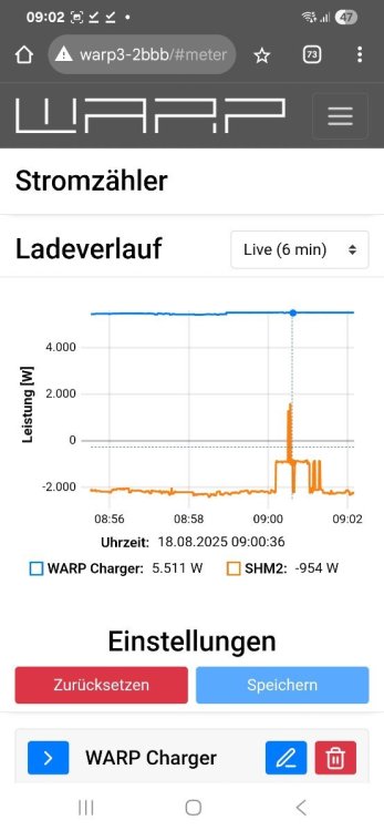 In diesen Logs sollte es ganz gut zu sehen sein. Ich glaube der kleine Peak der orangen Linie, der sehr kurzfristig über die Null geht, verhindert jeweils die Phasenumschaltung. Das müsste der Schattenscan (SMA Shadefix) des PV Wechselrichters sein. Kann ich eigentlich die Erzeugung des Wechselrichters als weitere Kurve einrichten, ohne irgendwas durcheinander zu bringen? Soll ja als Wert nicht verwendet werden in der Regelung. Bisher ist es ja nur der Smartmeter am Hausanschluss (SHM2.0) und der Zähler des Warp3. warp3-2bBb-Debug-Report-2025-08-18T09-09-44-666.txt warp3-2bBb-Debug-Report-2025-08-18T09-06-56-609.txt warp3-2bBb-Debug-Report-2025-08-18T09-00-15-713.txt -