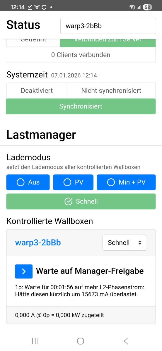 Hi Matze, vielen lieben Dank fürs schnelle Reinschauen! Dann war das Lastmanagement offenbar in Aktion. Nur um sicherzugehen, dass ich alles richtig konfiguriert habe, und doch kein Bug vorhanden ist: Bei mir zieht auf Phase 2 aktuell die Wärmepumpe mit ca. 10A. Dazu kam der Herd, den meine Frau zu dem Zeitpunkt einschaltete, mutmaßlich mit nicht mehr als 16A (eher weniger auf dieser Phase). Dann hätten wir immer noch 9A übrig für die Warp, bis die eingestellten 35A pro Phase am Hausanschluss überschritten sind. Meine Fragen zur Plausibilitätsprüfung: Wurde vorher bereits die Ladeleistung reduziert, oder lief das bis zur Abschaltung auf konstant 16A pro Phase weiter? Was mich stutzig macht: Wieso zeigt die Meldung im Screenshot in meinem ersten Beitrag eine Überschreibung von über 15000 mA an? Wenn, dann dürfte doch nur um wenige A überschritten worden sein. Kannst du ggf. die Kurven aus meinem Log einmal posten? Durch Neustart der Warp nach dem Update der Firmware sind die bei mir nicht mehr verfügbar. Falls das alles passt, dann hat das Lastmanagement in diesem Fall ja exakt so funktioniert, wie es sollte. Dann ein großes Daumen hoch, Lasttest bestanden :-) Die Testfirmware werde ich installieren.