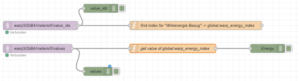 Ich habe das jetzt in node-red mit 2 Flows und paar Zeilen Javascript gelöst. mqtt Output fehlt noch. Erzeuge damit ein neues Topic... Vielleicht hilft es dem einen oder anderen. Funktion: find index for ... for (let i= 0; i<msg.payload.length; i++) { if ( msg.payload[i] == 209 ) { global.set('warp_energy_index', i) } } return null; Funktion: get value of ... var i= null; if ( (i= global.get("warp_energy_index")) != null) { var newMsg = { payload: msg.payload[i] }; return newMsg; } return null; -