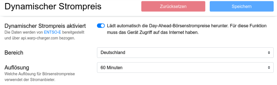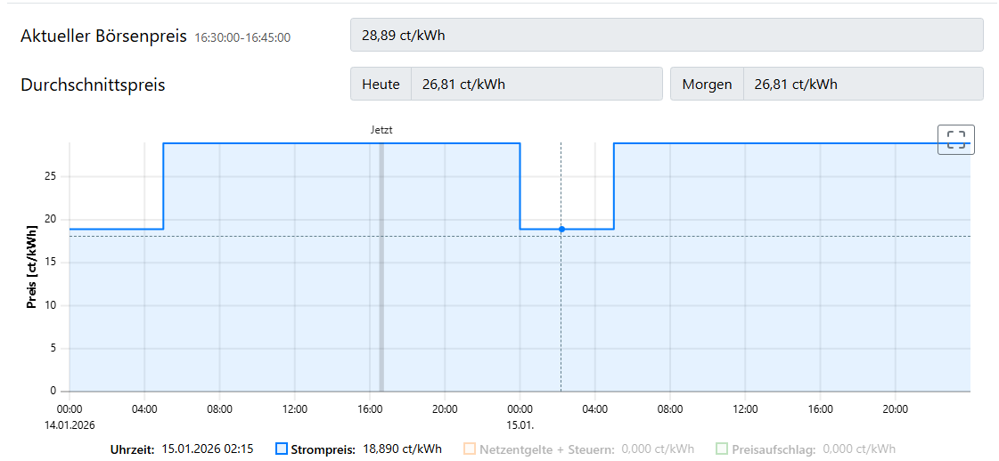 Hallo zusammen, ist eine Unterstützung von nicht ganz Dynamischen Tarifen geplant? Octopus Go hat von 0 bis 5 Uhr nachts sehr günstigen Tarif, restliche Zeit etwas teurer. EnBW Strom SparZeit bietet günstige Zeit zwischen 0 bis 6 und 10 bis 16 Uhr "günstige Zeit" und Restliche Zeit teurer. Wenn man das ganze mit $14a Module 3 kombiniert, dann hat man zu bestimmten Zeiten andere Netzentgelte, also variieren die Preise wieder etwas. Mir geht es um keine APIs, sondern, dass User selbst für 24h möglichst in 15 min Auflösung die Tarife selbst hinterlegen kann (und selbst aktualisieren soll) Mit dem hinterlegtem Tarif wird dann zu günstigen Zeiten geladen, aber auch entsprechend Preis kalkuliert. P.S. warum die 15 Min Auflösung: bei uns in der Region wird Modul 3 in 15 min Auflösung angeboten Ich stelle mir es so vor: Bereich: Benutzerdefiniter Tarif Auflösung 15/60 min und dann dann einfach Eingabefelder anzeigen wo der User die Bruttopreise eingibt.