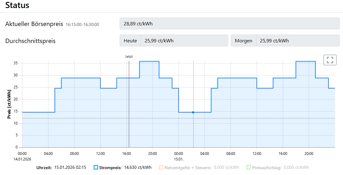 man war das eine schwerer Geburt (wenn man wenig Ahnung von Servern/Zertifikaten usw. hat). Aber dank AI läuft eigener Python-Preis-Server auf einem RasPi. Python Script # -*- coding: utf-8 -*- # wapr_prices_server.py (Python 2.7 kompatibel) from BaseHTTPServer import BaseHTTPRequestHandler, HTTPServer import time import json # Konstante Preise (Octopus Go): 2 Tage = 192 Werte # 0:00-4:59 → 18890 (20×), 5:00-23:59 → 28890 (76×) → wiederholt für Tag 2 PRICES = ( [18890] * 20 + [28890] * 76 + # Tag 1 [18890] * 20 + [28890] * 76 # Tag 2 ) assert len(PRICES) == 192, "Preis-Array muss genau 192 Eintraege haben" START_TIMESTAMP = 1768258800 EPOCH_DAY_SECONDS = 86400 class PriceHandler(BaseHTTPRequestHandler): def do_GET(self): if self.path != '/v1/day_ahead_prices/de/15min': self.send_error(404, "Not Found") return now = int(time.time()) days_passed = (now - START_TIMESTAMP) // EPOCH_DAY_SECONDS current_first = START_TIMESTAMP + days_passed * EPOCH_DAY_SECONDS current_next = current_first + EPOCH_DAY_SECONDS data = { "first_date": current_first, "prices": PRICES, "next_date": current_next } self.send_response(200) self.send_header("Content-type", "application/json") self.send_header("Access-Control-Allow-Origin", "*") self.end_headers() # Kompakte JSON (spart Bandbreite) json_str = json.dumps(data, separators=(',', ':')) self.wfile.write(json_str) if __name__ == '__main__': server_address = ('', 1234) httpd = HTTPServer(server_address, PriceHandler) print "Fake Strompreis-Server laeuft auf http://0.0.0.0:1234/v1/day_ahead_prices/de/15min" print "Beispiel: curl http://raspberry:1234/v1/day_ahead_prices/de/15min" httpd.serve_forever()und wenn man noch Modul 3 drauf legt (N-Ergie) dann wird es noch ein Tick spannender: