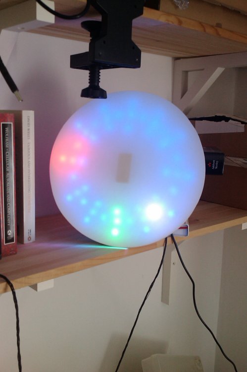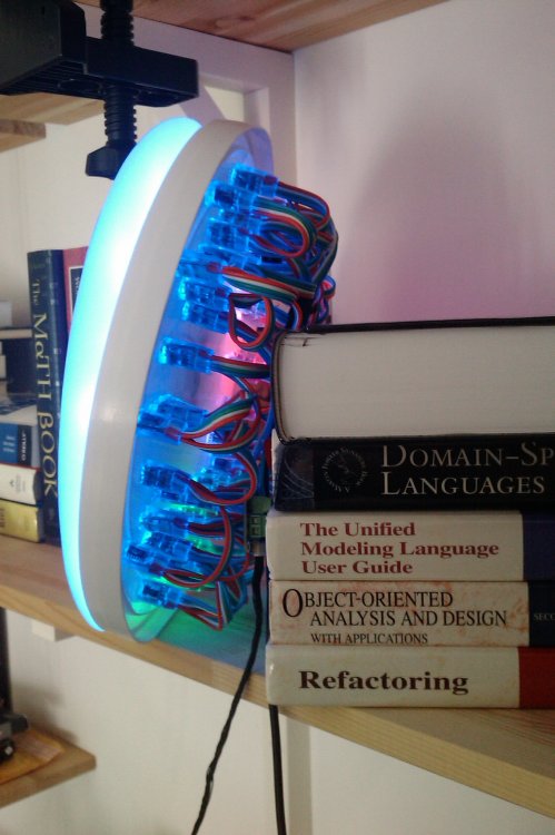 Required: * 1x 50-LED strip of RGB "pixels". * 1x LEDStrip bricklet * 1x round, drillable disc * 1x piece of paper cut to disc shape * 1x drill with 12mm drill bit * 1x bit of software A clock face consists of at least 12 indications for the 12 hours. I organised the LEDs to show each hour as a 3-LED "line", and the remaining LEDs I used to indicate the half-hour points between the hours (see picture). That meant using 4 LEDs per hour segment, using up 48 LEDs of the available 50. I used a plastic paint tub lid as my physical foundation to position the LEDs. Drilling the holes had to be done fairly accurately, otherwise the end-effect would look messy. Once all LEDs were pushed through their holes, I also added a sheet of paper to cover them all, and diffuse the individual lights. This gives the clock a more "designer" look, and hides the raw LEDs completely. I've got the LED power supply hooked up to a power meter, and I'm delighted to see that the LEDs only consume 1-3 Watts (the consumption varies, because the software actually creates a pulsating light effect with the "background" LEDs).