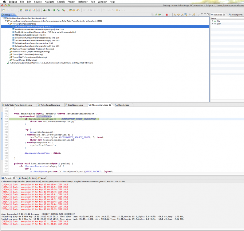Hi, To try and get round the now-and-again problem of my stack locking up (not just crashing, but totally locking up), I plugged my stack's power-supply in an IKEA 2 euro timer switch. Every 6 hours, I let the timer switch cut the power for 30 mins, thus ensuring that my stack is (hard) reset every 6 hours. I thought that the TF API auto reconnect feature would ensure my controlling program would be able to reconnect to my stack every time, albeit after trying for 30 minutes each time the stack power is cut. Unfortunately, my program fails to auto-reconnect most of the time. I'm attaching a screenshot of the Eclipse debugger showing the main thread suspended .. to show what it is doing. The thread always appears to be waiting on a socketMutex. Could this be a bug? Or am I missing something else? Thx. -