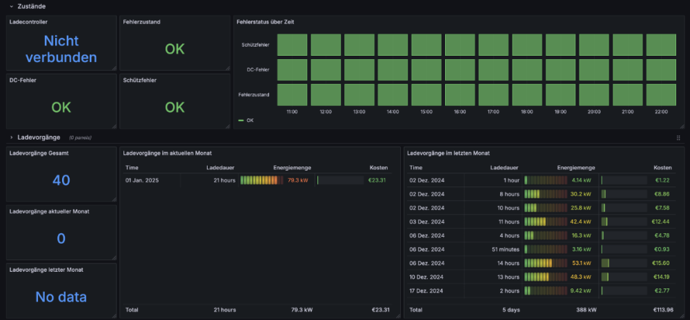 Das Grafana Dashboard hatte auch noch einen Fehler. Bei mir steht bei "Ladevorgänge aktueller Monat" und "Ladevorgänge letzter Monat" immer 0. Da muss ich mal nachschauen
