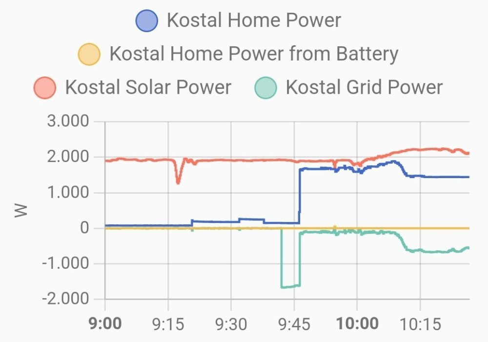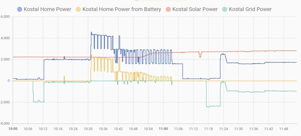 Die Folge ist, dass die Batterie den dann fehlenden Überschuss liefern muss, was in der Folge dazu führt, dass die Batterie nach 5 Minuten wieder nachgeladen wird.