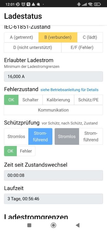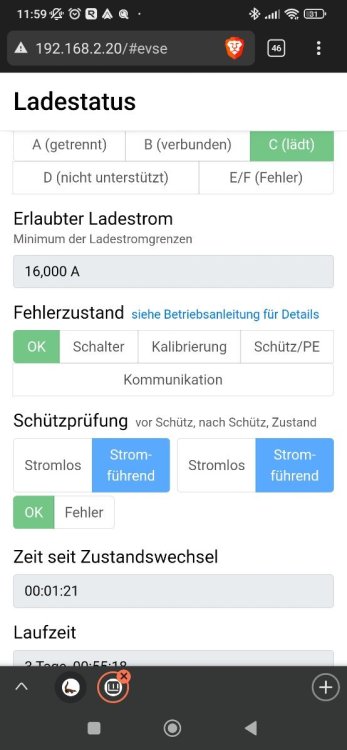 Hallo, Vorgeschichte: ich habe 2* Warp1 Pro bei mir zu Hause hängen. Beide haben vor kurzem ein Software-Update (2.7.4+67bf4287) von mir bekommen. Ich mache das immer so, dass erst "der Linke" updated, wenn alles in Ordnung ist auch "der Rechte". Leider stellte sich erst später raus, dass "der Linke" das Fahrzeug nicht mehr laden kann, der andere schon. Lösungsversuch: Config-Reset, kein Erfolg, ... Factory-Reset ... kein Erfolg. Nach dem Factory Reset hatte er auch Schwierigkeiten den (Fallback-) AccessPoint offenzuhalten, war aber auch nicht im Wlan zu finden. Also alle Wlan-APs ausgeschaltet, nochmal Factory-Reset, dann konnte ich mit dem Laptop an seinen AP dort die Wlan Credential wieder eingeben. Sauber, "Der Linke" ist wieder im Netz. Noch mal ein Update, eingesielt auf 2.7.5, auch wenn im Nachhinein betrachtet keinen Sinn machte. Nun .... Status Quo: "Der Linke" steht momentan auf 2.7.5+67c9a630, startet Laden gar nicht. "Der Rechte" steht auf 2.7.4+67bf4287, startet Laden automatisch wie immer In der Web-Ansicht fällt mir kein Unterschied auf. in MQTT finde ich welche: cars/warp/links/evse/user_current: stand auf 0 (rechts 32000) cars/warp/links/evse/automation_current: stand auf 0 (rechts 32000) Beide Werte habe ich via MQTT auf den Wert des Rechten gesetzt, aber kein Unterschied, die Werte werden später wieder auf 0 gesetzt. Ladeversuch Links: Stecker in Auto, Auto erkennt WB, WB Relais schaltet (Screenshot 11:59), Kein Strom kommt ins Auto, Web-Ansicht sagt, dass vor und nach dem Schütz Spannung ist, Status OK nach ein 1-2 Minuten entsperrt das Auto die Ladebuchse (Screenshot 12:01) Ladeversuch Rechts: gleiches Auto, alles ok, Ladung statet. Bzgl. meiner Änderung der MQTT Werte: Der Ladestrom ist über die Pins auf 16A begrenzt. Bzgl. Autostart: Ich erinnere mich, dass es früher in der Web-Oberfläche eine Konfiguration für den Taster gab, die finde ich nicht mehr. Ich hatte die damals entweder auf "auto" gestellt oder irgnoriert, weils schon so passte. Was ist mit der Option heute? Ich habe mir mal das Diagnose-ChargLog erstellen lassen und muss noch schauen ob ich da was sehen kann. Hat jemand eine Idee? Vielen Dank.