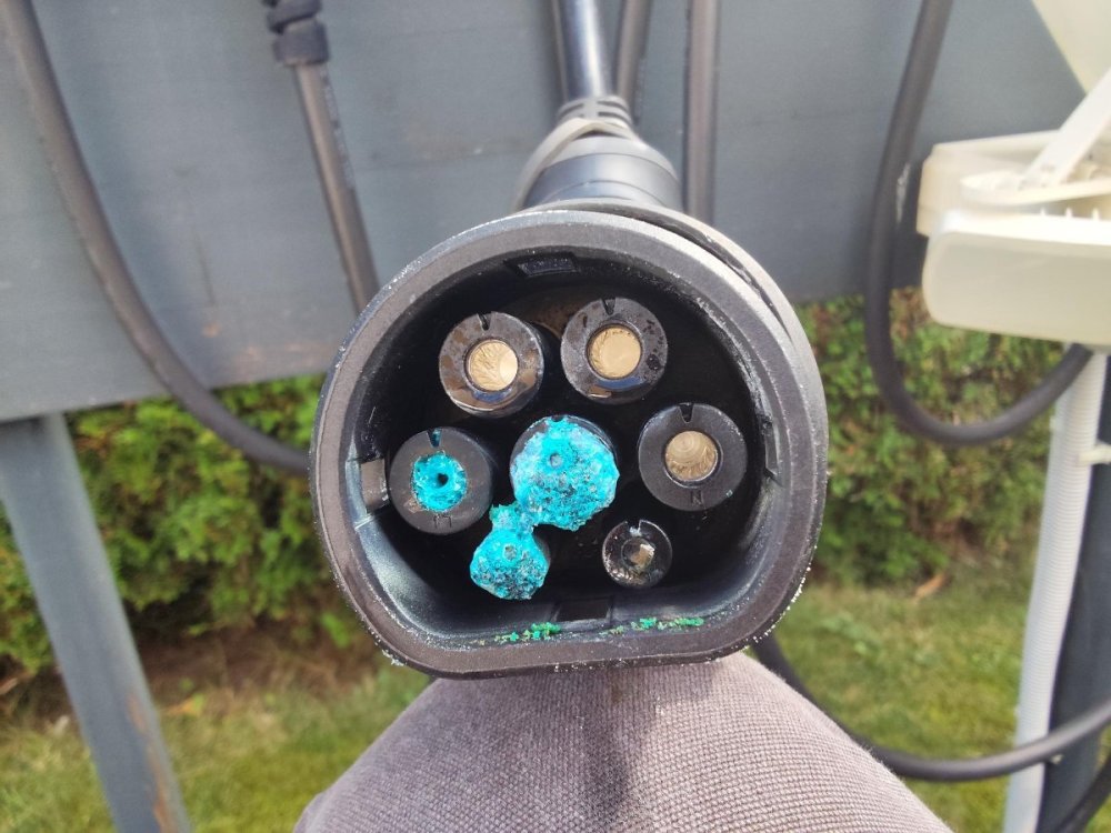 Hallo, ich hatte mein Problem eine Weile vertagt und gestern noch mal angefangen. Die Ablagerungen haben sich mittlerweile ausgeweitet, siehe Foto. Ich hab den Schnodder entfernt und den Stecker mit Isopropanol gereinigt. Sind überprüft, bei beiden Boxen, waren alle noch fest. Nach der Reinigung hatte ich stromlos den Durchgang und Widerstand vom Stecker zum Schütz geprüft, danach eingeschaltet und dann festgestellt dass auf einer Phase keine Spannung am Eingang des Schütz gehabt. Trotzdem Auto angesteckt, dann, nach der Kommunikation, waren wieder alle 3 Phasen unter Strom und das Auto hat problemlos geladen. Kann das so sein oder habt ich vorher zweimal falsch gemessen? -