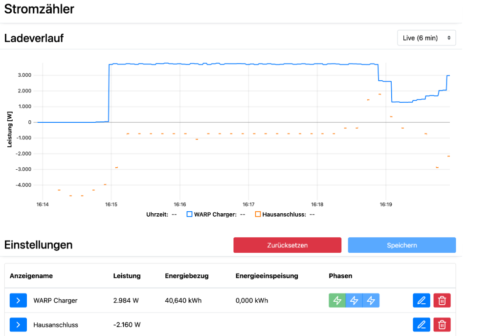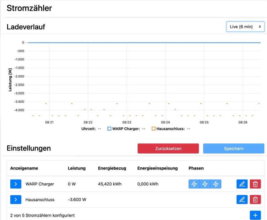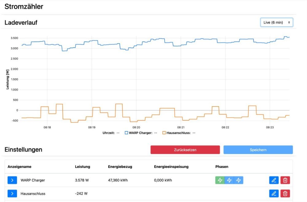 v0.0.4 müsste das jetzt richtig machen. Ich probier das morgen aus. def calcPower(self, payload) -> float: """ Calculate power from payload using MeterReading class. Args: payload: The decoded JSON payload from MQTT message Returns: float: Calculated power in watts """ # get the timestamp timestamp_str = payload.get(self.time_field) # Get the data from the payload data = payload.get(self.power_tag, {}) # Extract values e_in = data.get(self.in_field) e_out = data.get(self.out_field) power_magnitude = data.get(self.power_field) # Create current reading current = MeterReading(kWh_in=e_in, kWh_out=e_out, time_stamp=timestamp_str) # If we don't have a previous reading, store this one and return fallback power if not hasattr(self, "_last_reading"): active_power = None else: # calc power roughly from meter reading active_power = current.active_power(self._last_reading) # if we have a precise power magnitude we will use it: if power_magnitude: delta_in = e_in - self._last_reading.kWh_in delta_out = e_out - self._last_reading.kWh_out sign = 1 if delta_in >= delta_out else -1 active_power=sign*power_magnitude active_power=round(active_power) # Update stored reading self._last_reading = current return active_power Das Vorzeichen wird über die in/out Zähler bestimmt. Wirkleistung kommt vom Power2 Wert, der aber immer positiv ist. Die Anzeige in der warp UI sieht jetzt richtig aus das MQTT Intervall habe ich auf 10 Sekunden gestellt der aktuelle Wert wird dann einfach jede Sekunde gesendet. Das müsste deutlich besser funktionieren. -