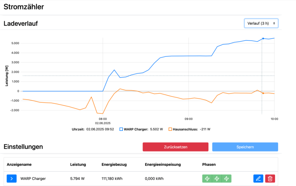 In dem Beitrag: ist ja bereits diskutiert worden, wie ein Tasmota-Stromzähler seine Werte an die Warp3 liefern kann. Die Lösung dort sendet direkt per Post-API die Werte. Das funktioniert aber nicht so wie gewünscht, weil der Power Wert z.B. bei eHZ Zählern immer positiv ist, die Wallbox aber ein korrektes Vorzeichen erwartet. Zudem finde ich persönlich den Weg über MQTT zukunftssicherer. MQTT ermöglicht eine saubere "Separation of Concerns". Als Lösungsvorschlag habe ich ein python basiertes Middlewareprojekt gestartet - siehe https://github.com/WolfgangFahl/WarpMQTT2Api Bei mir läuft die Software auf einem raspberry PI. Einfach von pypi oder direkt vom github repository aus installieren. Dann gibt es ein warp3 Kommandozeilen-Werkzeug: warp3 -h usage: warp3 [-h] [--config-path CONFIG_PATH] [--mqtt-broker MQTT_BROKER] [--mqtt-port MQTT_PORT] [--mqtt-topic MQTT_TOPIC] [--mqtt-username MQTT_USERNAME] [--mqtt-password MQTT_PASSWORD] [--update-interval UPDATE_INTERVAL] [--dry-run] [--wallbox-host WALLBOX_HOST] [--power-tag POWER_TAG] [--in-field IN_FIELD] [--out-field OUT_FIELD] [--time-field TIME_FIELD] [--meter-id METER_ID] [--debug] MQTT to Warp3 Wallbox Middleware options: -h, --help show this help message and exit --config-path CONFIG_PATH Path to YAML configuration file --mqtt-broker MQTT_BROKER MQTT broker address --mqtt-port MQTT_PORT MQTT broker port --mqtt-topic MQTT_TOPIC MQTT topic to subscribe to --mqtt-username MQTT_USERNAME MQTT username --mqtt-password MQTT_PASSWORD MQTT password --update-interval UPDATE_INTERVAL Minimum update interval in seconds --dry-run Run without updating the wallbox --wallbox-host WALLBOX_HOST Wallbox host URL --power-tag POWER_TAG Tag in MQTT data containing power information --in-field IN_FIELD Field name in MQTT data containing energy input --out-field OUT_FIELD Field name in MQTT data containing energy output --time-field TIME_FIELD Field name in MQTT data containing timestamp --meter-id METER_ID Meter ID to use --debug Enable debug logging Ausgangspunkt ist ein tasmota-Zähler, der mit MQTT Nachrichten sendet. Siehe z.B. https://docs.bitshake.de/script/ Bei mir sehen diese Nachrichten so aus: {"Time":"2025-05-10T08:24:13","eHZ":{"E_in":67299.845,"E_out":50268.783,"Power":0,"Power2":4111}} Zunächst wird ein Stromzähler als API - Zähler für den Netzanschluss eingerichtet. Die ID des Zähler kommt dann in die Konfigurationsdatei zur Beschreibung des Zählers und der MQTT Verbindung: # WF 2025-09-05 # warp3 middleware configs # Wallbox wallbox_host: "http://wallbox.bitplan.com" # Zähler meter_id: 2 # Update Frequenz in Sekunden - 1 bis 2 Sekunden sind sinnvoll update_interval: 1 # Beschreibung der MQTT Nachricht time_field: "Time" power_tag: "eHZ" # Genaue Wirkleistung power_field: "Power2" # Zählerwerte zur Abschätzung und Vorzeichenberechnung in_field: "E_in" out_field: "E_out" # MQTT Kommunikationseinstellungen mqtt_broker: "mqtt.bitplan.com" mqtt_port: 1883 mqtt_topic: "tele/tasmota_****/SENSOR" mqtt_username: "****" mqtt_password: "****" update_interval: 1 # - every second dry_run: false Ein start script: #!/bin/bash # WF 2025-05-10 # Start Warp3 with nohup and log to /var/log/warp3 LOGDIR="/var/log/warp3" LOGFILE="$LOGDIR/warp3.log" APP="warp3" OPTIONS="--config-path /home/wf/.warp3/config.yaml" sudo mkdir -p "$LOGDIR" sudo chmod 755 "$LOGDIR" sudo chown wf:wf $LOGDIR timestamp=$(date '+%F %T') echo "$timestamp - INFO - 🚀 Starting warp3" >> "$LOGFILE" nohup "$APP" $OPTIONS >> "$LOGFILE" 2>&1 & crontab eintrag: # run warp3 on reboot @reboot /home/wf/bin/warp3start dann erscheint im Log 2025-05-10 08:13:27 - INFO - 🚀 Starting warp3 2025-05-10 08:13:28,476 - INFO - Starting MQTT to Warp3 middleware 2025-05-10 08:13:28,476 - INFO - MQTT broker: mqtt.bitplan.com 2025-05-10 08:13:28,476 - INFO - MQTT topic: tele/tasmota_B13330/SENSOR 2025-05-10 08:13:28,477 - INFO - Wallbox host: http://wallbox.bitplan.com 2025-05-10 08:13:28,477 - INFO - Power tag: eHZ 2025-05-10 08:13:28,477 - INFO - Meter ID: 2 2025-05-10 08:13:28,503 - INFO - ✅ Connected to Warp3 - Firmware version: 2.8.0+6810d7c9 2025-05-10 08:13:28,523 - INFO - ✅ Meter 'Hausanschluss' at location 4 measures: 74: Summe der Phasenwirkleistungen (Bezug - Einspeisung) 2025-05-10 08:13:28,528 - INFO - Starting MQTT loop 2025-05-10 08:13:28,529 - INFO - Connected to MQTT broker at mqtt.bitplan.com 2025-05-10 08:13:28,529 - INFO - Subscribed to tele/tasmota_B13330/SENSOR 2025-05-10 08:13:43,751 - INFO - Power value: -3600W 2025-05-10 08:13:43,777 - INFO - ✅ -3600 Watt set 2025-05-10 08:13:53,754 - INFO - Power value: -3960W 2025-05-10 08:13:53,777 - INFO - ✅ -3960 Watt set 2025-05-10 08:14:03,761 - INFO - Power value: -3960W 2025-05-10 08:14:03,786 - INFO - ✅ -3960 Watt set Nun ist der Zähler mit der eingestellten Tasmota-Sende Frequenz für die wallbox sichtbar.
