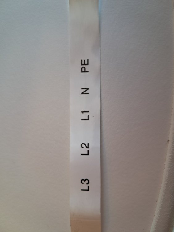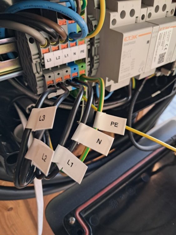 Die Zuleitung hatte keine Farbkodierung, daher wurden zunächst L1, L2, L3, N und PE mit einem Beschriftungsgerät markiert, damit diese später wieder korrekt angeschlossen werden können. In der Wallbox erhielten sicherheitshalber einige Anschlüsse ebenfalls eine Beschriftung. Beim Lösen der Verbindungen zum NFC, der Zuleitung und dem Deckel ist es wichtig, den Zustand zu dokumentieren – Fotos eignen sich hierfür gut.