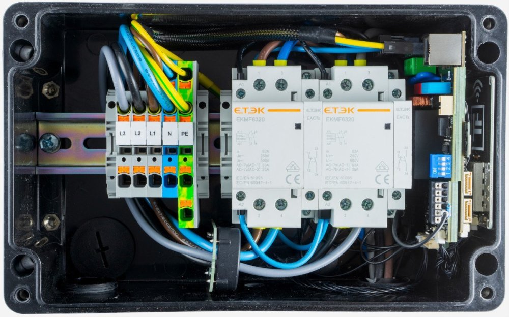 Der Zusammenbau gestaltet sich leider nicht ganz frustrationsfrei. Die NFC-Elektronik ist verklebt, und dem Gehäuse fehlen einige Millimeter in der Breite, um den fertigen Block problemlos einzubauen. Hilfe war nötig (meine Frau war so freundlich): gegebenenfalls Sekundenkleber, damit die Scheibe nicht von der Schraube fällt, ein Magnet, um die Schraube an ihren Platz zu bringen (falls man nicht vorher daran gedacht hatte), sowie viel Geduld und Fingerspitzengefühl. Aufgrund dieser scheinbar einfachen mechanischen Hürde, die letztlich viel Zeit und Nerven gekostet hat, würde ich beim aktuellen Design der Wallbox den Zusammenbau nicht noch einmal selbst versuchen. Meine Selbstbaubox für meinen Peugeot Ion aus dem Jahr 2017 hatte da deutlich mehr Platz