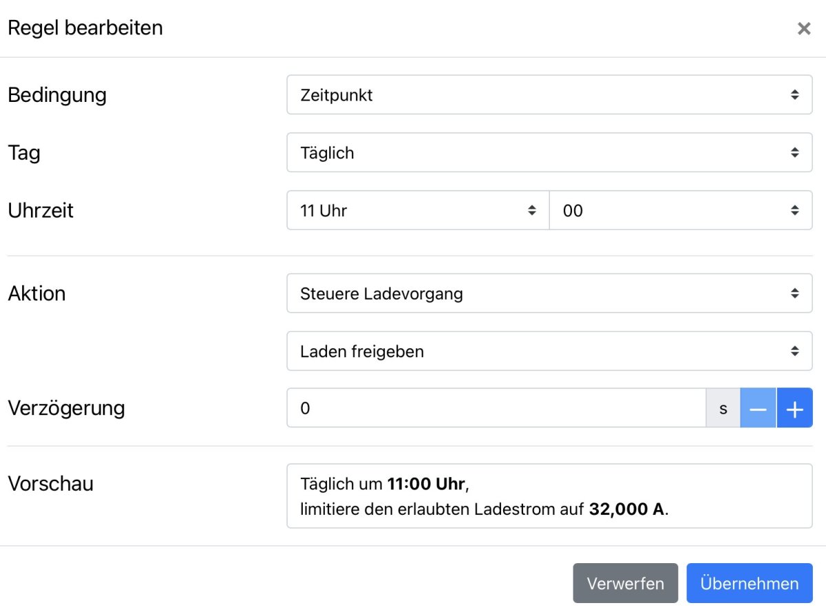 Ich habe aktuell noch das Problem, das mein Batteriewechselrichter zu klein dimensioniert ist. Ich werde ab Ende Februar ca. 1-2kW mehr an Leistung haben als mein Batteriewechselrichter in die Batterie packen kann. Damit ich diese Leistung nicht ins Netz abgebe für 7 Cent würde ich gerne mein Auto laden. Also Auto mit wallbox verbinden, den Ladevorgang auf stop schalten, damit die Automatisierung dann zu einem späteren Zeitpunkt, den Ladevorgang startet. Jetzt dachte ich, das ich über die Automatisierung ab einem bestimmten Zeitpunkt einfach einphasig mit 8A lade (das wären dann ca. 2kW) wenn ich weiß das die Sonne den ganzen Tag über scheint. Lässt sich so etwas durch die Automatisierung realisieren und wenn ja, habt ihr hier irgend welche Beispiele wie dies zu realisieren ist? Bis jetzt habe ich den Ladestrom immer manuell über die Status-Seite eingestellt.
