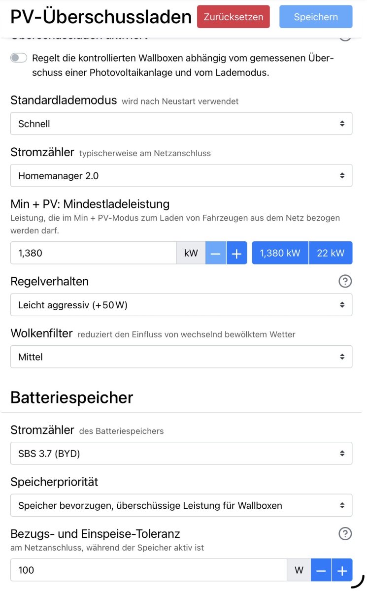 Vielen Dank für deine immer freundliche Unterstützung. Wenn ich dann meine oben bebaute Regel auf den Zeitpunkt stelle wo ich sagen wir sicher 200W PV-Überschuss habe, da mein SBS 3.7 nicht mehr in die Batterie packen kann und dann einfach mit Min.+PV (6A) laden würde, würde ich die Einspeisung minimieren. Darüber hinaus wird bei Wolken, der Ladevorgang nicht abgebrochen, sonder läuft kurzfristig über den Speicher. Wäre meine Regel oben o.k.? Dann müsste ich den Ladevorgang dann nur zu einem späteren Zeitpunkt abschalten, damit mein Speicher nicht leer gemacht wird. Dazu müsste ich dann eine neue Regel bauen.
