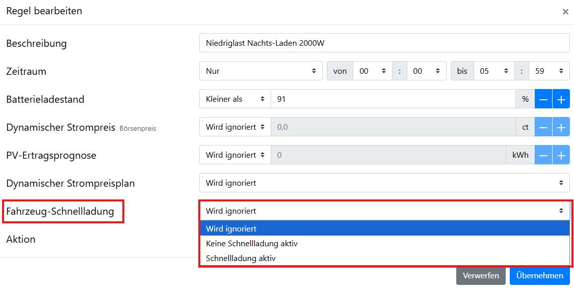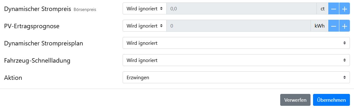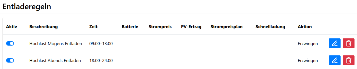 Hallo @MatzeTF Ich kann doch nur einstellen Blockieren oder Erzwingen Und da ich in den Hochlastzeiten aus der Batterie "Leben" möchte bleibt doch nur Erzwingen! Oder wie müsste ich das einstellen ?