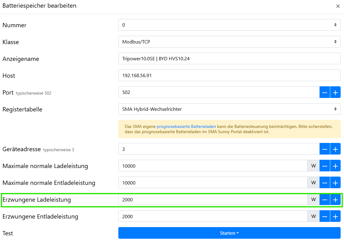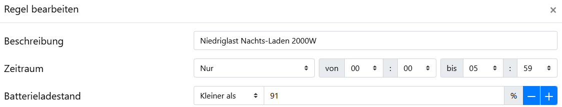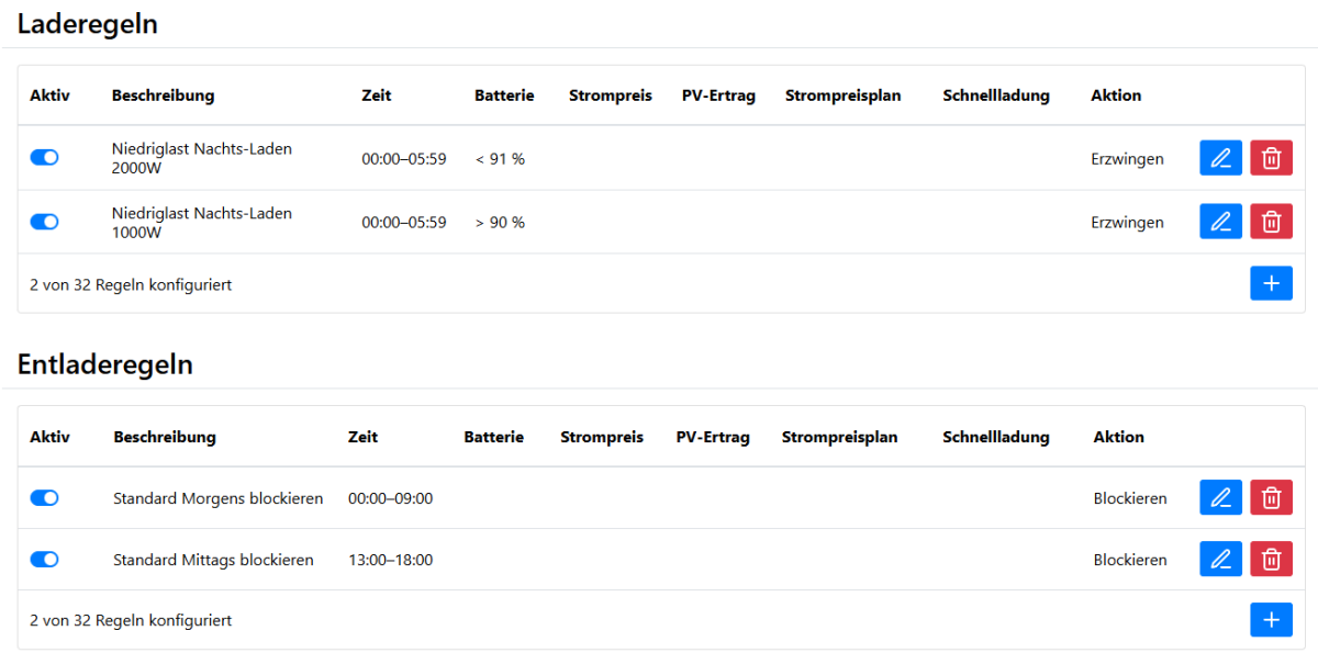 Hallo @MatzeTF Heute Morgen mal wieder ein Test gemacht zum Laden der Batterie, da ich Wissen wollte wo die Ladeleistung von 2000W herkommt aus dem ersten Test. Die Ladeleistung (Erzwungene Ladeleistung) kommt aus diesem Parameter Also kann ich dort leider nur Global die Ladeleistung/Entladeleistung einstellen, jetzt hier im Beispiel 3000 Watt, die dann immer gültig ist sobald aus dem Netz geladen oder in das Netz entladen werden soll. Ok jetzt aber zu meiner Erkenntnis: Laden aktivieren Einstellung von 3000 Watt eingestellt Übernehme Laderegel erstellt die von 10:00 Uhr bis 11:00 gilt Übernehmen Alles läuft wie eingestellt Jetzt wieder Deaktivieren nach dem Neustart Der Speicher wird weiter geladen mit der angegebenen Ladeleistung Das sollte so nicht sein, da die Steuerung ja ausgeschaltet wurde, somit dann auch die Ladung aufhören sollte! Bin mal gespannt ob die Steuerung dies um 11:00 deaktiviert, da diese ja deaktiviert wurde! Ich habe festgestellt das nach einer gewissen Zeit die Ladung reduziert wurde auf das was gerade vom Dach übrig war, wie lange der Zeitverzug war, konnte ich nicht bestimmen! Ich bin immer noch der Meinung das die Ladeleistung/Entladeleistung besser bei den Einstellungen der Laderegeln/Entladeregeln eingestellt werden sollte, auch für jede Regel einzeln auf dann halt ein Minimum von 0,1C (1000 Watt bei meinem Speicher) begrenzen, auch wegen der Übersichtlichkeit. Die Maximale normale Ladeleistung kann ja unter der Einstellung Batteriespeicher bleiben, dort passt diese auch besser hin! Ich denke deshalb ist auch eine "Beta" Software da, um Rückmeldungen an Euch zu geben! Dies macht auch auf andere Weise Sinn, im Moment (in 2026) ist bei mir das Niedrigpreis (Festpreistarif) Ladefenster für die niedrigen Netzentgelte 6 Stunden und ich bekäme den Speicher in dieser Zeit "Voll" mit 0,2C, was ist aber wenn das Zeitfenster kürzer ist nur 3 Stunden dann muss ich die Ladeleistung >Erzwingen und würde dann bis hundert 100% mit dieser eingestellten erzwungenen Ladung (Beispiel 10,2 kW/3Stunden=3400Watt) den Speicher bis zum Ende Laden. Die drei vorgeschriebenen Zeitfenster für Netzentgelte sind von jedem Verteilnetzbetreiber sehr unterschiedlich gestaltet, auch um das §14a EnWG Modul 3 zu verhindern und deshalb bewusst Verbraucherunfreundlich gewählt, sollte man auch bedenken. So der Test wurde dann komplett beendet mit dem erreichen des SOC von >91% mit der Beendung der Ladung mit 3000Watt!