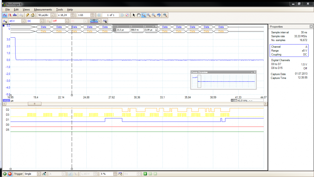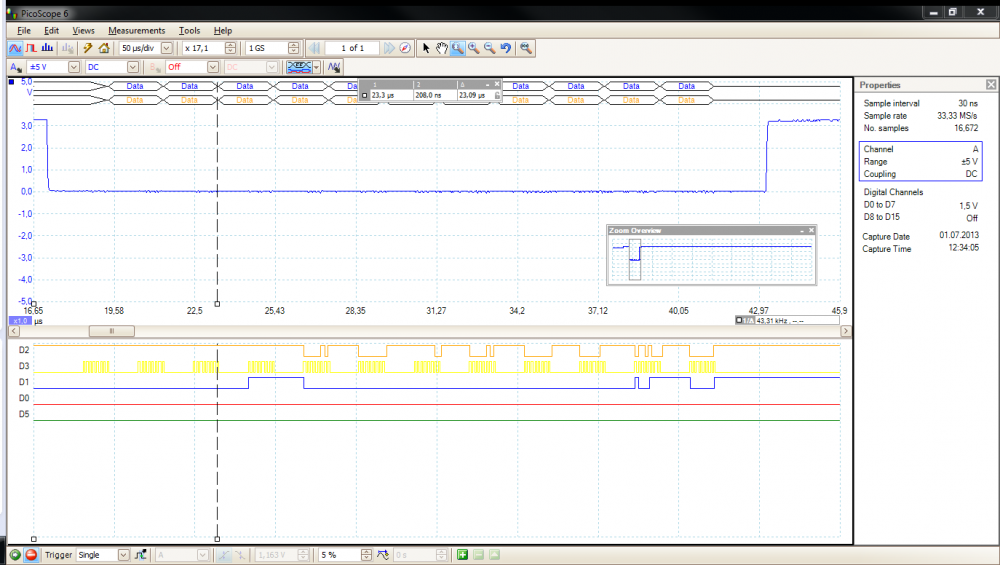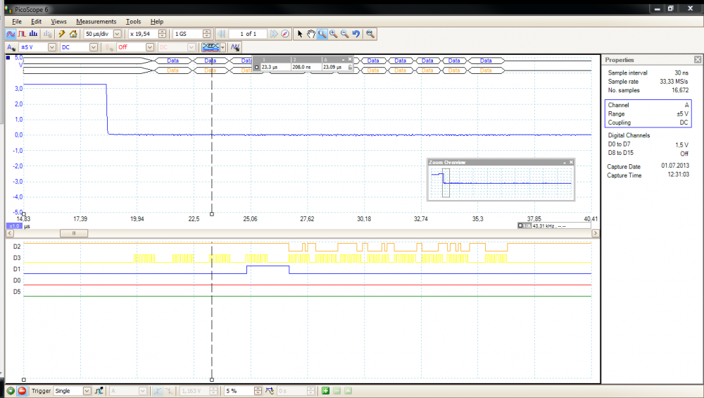 Hallo, so. Also das Problem besteht weiterhin. Ich hab mal die Bilder vom LogicAnalyzer angefügt. Beim Wert SPI_DELAY_BETWEEN_TRANSFER = 0 funktioniert es nicht. Beim Wert 500 sieht man das der Slave das CRC Byte zu spät überträgt. Beim Wert 1000 funktioniert es. Und der Slave sendet auch die Ack. - Die Clock habe ich mittlerweile Überprüft. - Problem beim Nutzen eines GPIOs ist, das diese sehr langsam an aus geschaltet werden. - Des weiteren habe ich im Master Brick eine Funktion implementiert die mir die anzahl der Übertragungen anzeigt. dabei auch die fehlerhaften, leeren, und erfolgreichen. Dabei ist aufgefallen, das bei meinem (mit einstellung 1000 s.o.) sowie auch bei den anderen Bricks zu beginn 11 Fehl übertragungen passieren.?! Gruß David