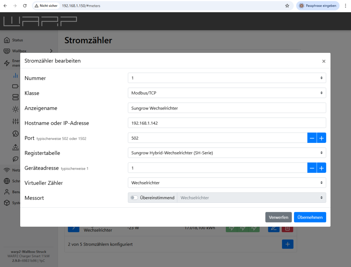Unser erstes E-Auto ist jetzt im Einsatz - verträgt sich im Prinzip auch gut mit der WARP2-Smart. Aber das PV-Überschussladen funktioniert nicht wie erwartet. Liegt das vielleicht an der unvollständigen Kommunikation zwischen Wallbox und Sungrow-Wechselrichter? Siehe angehängte Bilder Die angezeigte "Leistung" stimmt sehr genau mit dem auch via iSolarCloud dargestellten "PV-Ertrag" überein - wenn auch mit negativem Vorzeichen. Unter "Energiebezug" wird beim Zähler aber nichts angezeigt. Was läuft hier falsch? Herzliche Grüße