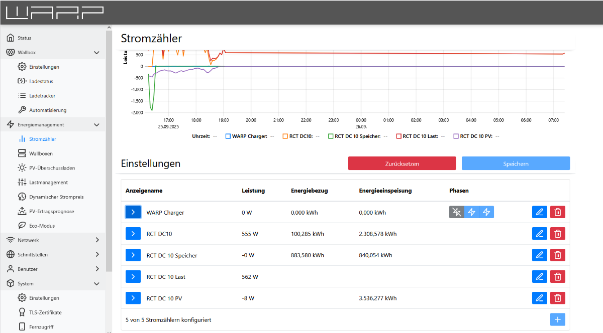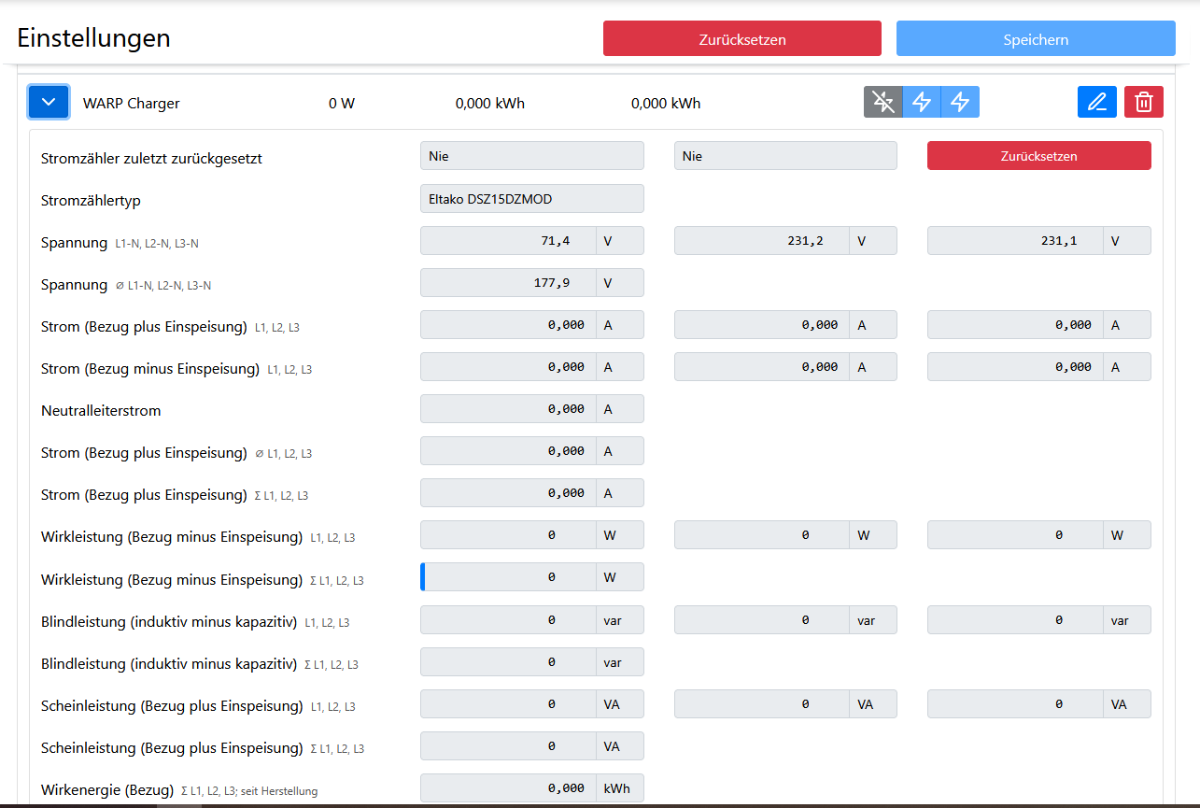 4. Hallo, der Ersatzzähler kam heute Morgen bei mir an, und ich habe ihn bereits eingebaut. Das Disdplay des Zählers sieht soweit ok aus. Allerdings sagt mir das Webinterface unter dem Menuepunkt: Enegiemangagement/Stromzähler/WarpCharger das kein Zähler angeschlossen sei. Beim durchscrollen der Menues des Eltako haeb ich gesehen, das dort evtl eine Adresse eingeben werden muss? Welche wäre das? Gibt es sonst noch etwas einzustellen? Grüße aus der sonnigen Eifel Klaus