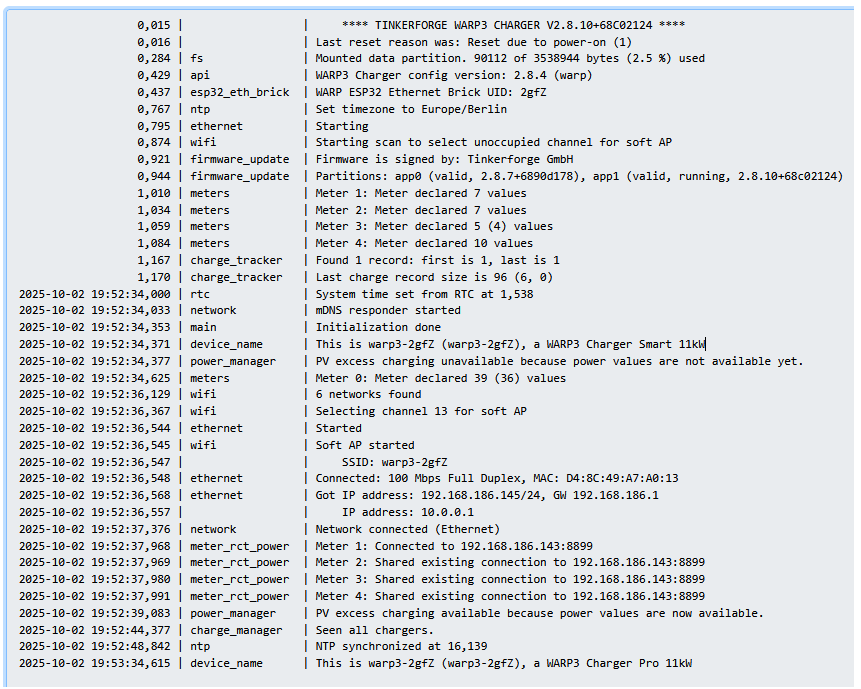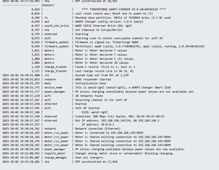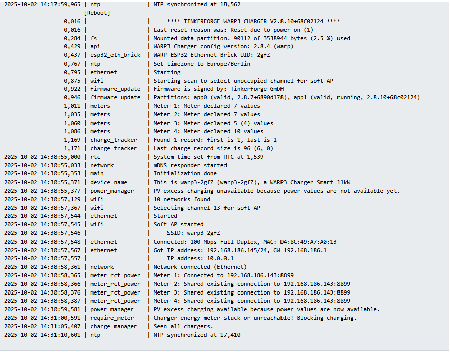 1. Hallo, die beschriebenen Maßnahnahmen habe ich bereits alle durchgeführt. siehe meine mail AW zur Versandinfo: Inhalt s.u.. ich habe das Gerät heute Nachmittag in die Wallbox eingebaut. Das Display des Zählers zeigt die korrekten Spannungswerte aller drei Phasen an. Die Adresse des Geräts lautete 001. Allerdings zeigte die Webseite der Box das Gerät nicht an. Weder auf der Menueseite Ebnergiemangement/Stromzähler /WarpCharger noch auf der Stausseite. Im anhängenden Ereignis Log wurde der Zähler nicht erkannt. In einem Forumsbeitragb Beitrag vom 1.Sepember 2025 habe ich ein ähnliches Problem gefunden. Dort stellte sich eine fehelrhafte Verbindung der Datenleitung zwischen Zähler und Controller als Ursache heraus. Ich habe daraufhin folgende Tests durchgesführt. - Die beiden Leitungen nochmals neu angeschlossen und festgezogen( rot links, grün rechts) --> negativ - hochohmige Frequenzmessung mittels Multimeter über den beiden Klemmen ergab ca. 12 Hz. Ein Oszilloskop steht mir leider nicht zur Verfügung - zusätzlich den 120 Ohm Widerstand,laut Anleitung des Zählers, parallel zu den beiden Anschlussklemmen angeklemmt --> negativ - Die beiden Leitungen getauscht (grün links, rot rechts) --> negativ --> ich befürchtete bereits den Controller beschädigt zu haben, und habe daher den ursprünglichen Zähler wieder eingebaut und angeschlossen (rot links, grün rechts) --> Positiv: der Controller erkennt den Zähler. Leider ist der ursprüngliche Fehler (Spannung auf L1 falsch, zur Zeit 3,3 V) wieder da. Leider ist der ursprüngliche Fehler (Spannung auf L1 falsch zur Zeit 3,3 V) wieder da. Immerhin funktioniert die Wallbox mit dem Zähler. Gibt es von Ihrer Seite noch eine Idee was ich prüfen könnte? Wie ist Ihr Vorschlag für die weitere Vorgehensweise?