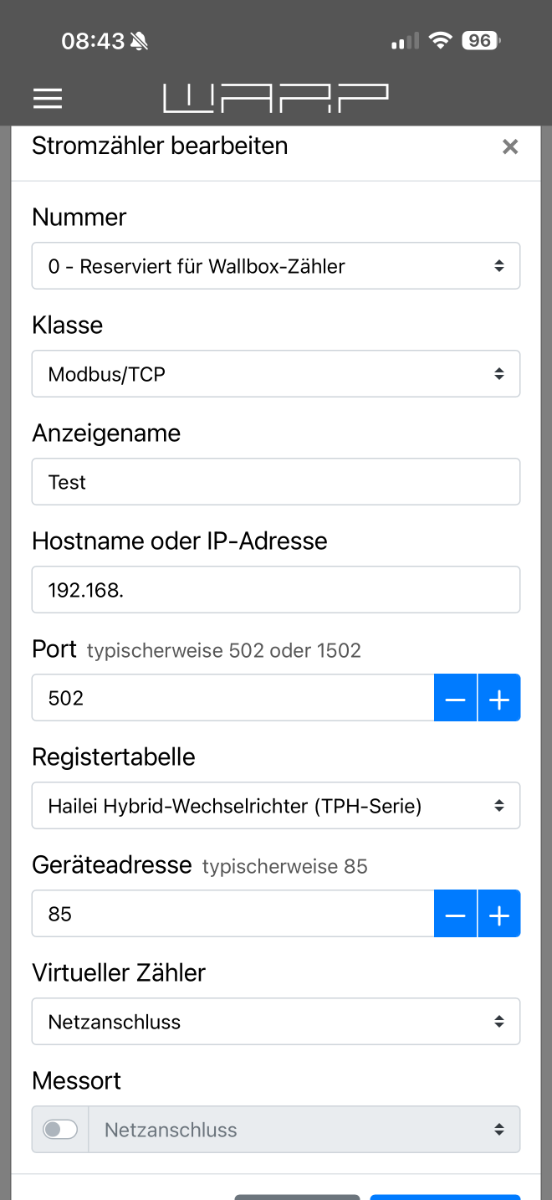2. Guten Morgen, ich versuche den gleichen Zähler (Netz) den ich im Energie Manager nutze auch in der Wallbox zu konfigurieren. Dieser ist am Wechselrichter angeschlossen und ich kann alle Werte im EMS sehen. In der Wallbox steht jedoch die Meldung keine Werte... Ist das nicht möglich, brauche ich noch einen weiteren Zähler, oder wo liegt der Fehler? Die Daten hätte ich gerne Verbrauch am Fahrzeug. Hardware: WarpCharger 3 Warp EMS 2 Hailei Wechselrichter