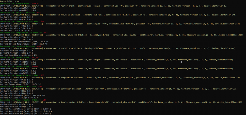 ok, I have made some first basic steps... this is still a very very basic python script for testing... # connection parameter HOST = "192.168.52.55" PORT = 4215 # these needs to be used dynamically later... # right now, they are only for testing BARO_1_UID = "vNB" BARO_2_UID = "vHa" from tinkerforge.ip_connection import IPConnection from tinkerforge.bricklet_barometer import BrickletBarometer def cb_enumerate(uid, connected_uid, position, hardware_version, firmware_version, devic> # removed output for shorter code here def cb_air_pressure(air_pressure): # here, I would like to output from which bricklet the information came # since we do have two barometers connected, the output should somehow include the uid of the bricklet...? print("Air Pressure: " + str(air_pressure/1000.0) + " hPA") def cb_altitude(altitude): # here, I would like to output from which bricklet the information came # since we do have two barometers connected, the output should somehow include the uid of the bricklet...? print("Altitude: " + str(altitude/100.0) + " m") if __name__ == "__main__": ipcon = IPConnection() # Create IP connection # connect to the barometer bricklet(s) # if multiple devices with the same device-id are found, it should be done dynamically # f.e. for each barometer in barometers... something like that. b1 = BrickletBarometer(BARO_1_UID, ipcon) b2 = BrickletBarometer(BARO_2_UID, ipcon) ipcon.connect(HOST, PORT) # Connect to brickd or to network attached device ipcon.register_callback(IPConnection.CALLBACK_ENUMERATE, cb_enumerate) ipcon.enumerate() # register the callback(s) and set the callback period(s) for the barometer bricklet(s) # if multiple devices with the same device-id are found it should be done dynamically # f.e. for each barometer in barometers... something like that b1.register_callback(b1.CALLBACK_AIR_PRESSURE, cb_air_pressure) b2.register_callback(b2.CALLBACK_AIR_PRESSURE, cb_air_pressure) b1.register_callback(b1.CALLBACK_ALTITUDE, cb_altitude) b2.register_callback(b2.CALLBACK_ALTITUDE, cb_altitude) b1.set_air_pressure_callback_period(1000) b2.set_air_pressure_callback_period(1000) b1.set_altitude_callback_period(1000) b2.set_altitude_callback_period(1000) I would like to know, if it is somehow possible to be a bit more dynamic with the detection of the connected bricklets? For example, I have two barometers connected. I would like to output the UID of the bricklet within the cb_air_pressure and cb_altitude into something like that: def cb_air_pressure(air_pressure): # something like that: print("Air Pressure " + UID + ": .....") def cb_altitude(altitude): # something like that: print("Altitude " + UID + ": .....") Also, I am pretty sure that this can be reduced and somehow be done for each device recognized: b1 = BrickletBarometer(BARO_1_UID, ipcon) b1.register_callback(b1.CALLBACK_AIR_PRESSURE, cb_air_pressure) b1.register_callback(b1.CALLBACK_ALTITUDE, cb_altitude) b1.set_air_pressure_callback_period(1000) b1.set_altitude_callback_period(1000) b2 = BrickletBarometer(BARO_2_UID, ipcon) b2.register_callback(b2.CALLBACK_AIR_PRESSURE, cb_air_pressure) b2.register_callback(b2.CALLBACK_ALTITUDE, cb_altitude) b2.set_air_pressure_callback_period(1000) b2.set_altitude_callback_period(1000) probably the syntax is not correct - but maybe, something like that: foreach(uid in barometer_uids) { b = BrickletBarometer(uid, ipcon) b.register.... b.set...... }