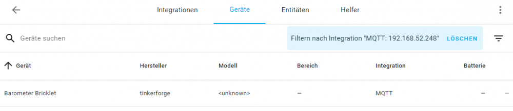 so, ich bin ein klein wenig weiter :) Die Auto-Erkennung funktioniert zwar noch nicht so zuverlässig, wie ich es gerne hätte ... das kann aber ggf. auch an meinem System liegen, da ich die Sensoren in HA entsprechend oft gelöscht und neu angelegt habe... Der nächste durchlauf wird daher mal mit einer "frischen" Datenbank sein ^^ Im Moment ist nur eine kleine Handvoll an alten Sensoren im Code umgesetzt... weitere werden folgen, diese kann ich aber mangels Hardware selber kaum testen. Für jeden Brick & jedes Bricklet wird ein eigenes "Device" in HomeAssistant angelegt Jedes Device ist dabei um die Information der UID - sowie, wenn vorhanden der UID des Bricks, an welches es angeschlossen ist benannt. Hier ist erkennbar, dass das Humidity Bricklet (eGQ), der MasterBrick (6qCxXx), das Temperature Bricklet (Temp2) und das Temperature IR Bricklet (zY2) jeweils am Master Brick (6m9VR4) angeschlossen sind. Diese Unterscheidung wird ggf. später notwendig, sollten mehrere eigenständige Stapel genutzt werden. Ob meine Software damit überhaupt umgehen kann, habe ich noch nicht getestet - der Fokus liegt im Moment nach wie vor auf einer rudimentären Funktionsweise... Jedes Device liefert informationen zur Installierten Firmware Version sowie der Hardware-Revision des Bricks / Bricklets. Ebenso werden die entsprechenden Sensor-Entitäten angelegt, wobei auch diese zur Identifizierung die UID mit im Namen tragen. Die Sensoren werden einmal bei der Enumerierung mittels .getXyz() abgerufen - danach über Callbacks, wenn sich der Wert ändert. Im Moment gibt es allerdings noch kleinere Probleme mit dem Sensor-Status direkt nach der Enumerierung... hier muss ich noch ein wenig arbeiten, da es ggf. notwendig ist, nach der Enumerierung den Stapel einmal zu resetten. Vermutlich irgend ein Timing Thema... ?! Eines der größten Probleme wird wohl sein, Aktoren hinzuzufügen. Mein Programm ist im Moment darauf ausgelegt, die Daten abzurufen und an HA zu schicken. Das funktioniert natürlich nicht, wenn eine eigene Programm-Logik vorhanden sein soll - oder aber, wenn aus HA heraus z.B. der Status eines Dual_Relay geändert werden soll... Hier wäre es zwar prinzipiell möglich, auf "eingehende" MQTT Nachrichten zu hören und dann entsprechende Aktionen auszuführen, da es sich aber stand jetzt noch nicht um eine eigene Integration für HomeAssistant handelt, können keine Steuerkomponenten hinzugefügt werden, welche das Automatisiert machen. Bei einer eigenständigen Integration würde sich auch der Umweg über MQTT erübrigen. Vielleicht gelingt es mir aber doch noch irgendwann, eine "halbwegs" brauchbare Integration zu machen...? -