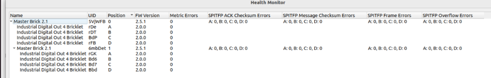 Hallo, ich baue mir mittels Raspberry Pi und Tinkerforge eine Haussteuerung. Die Steuerung kontrolliert aktuell einige Flurlichter, die Rollläden und die Türklingel. Die Motoren der Rollläden hängen mittels Zwischenrelais per 24 Volt an Industrial Digital Out Ausgängen. Die Industrial Out Bricklets sind in Schaltschrankgehäusen eingebaut. Mit einem der Kästen habe ich Probleme. In dem Kasten sind 8 Industrial Digital Out Bricklets (Version 1.0) verbaut. Dazu kommt, in der Reihenfolge von unten nach oben: Step-Down-Power Supply, Master Brick (2.1), Ethernet Extension, Master Brick (2.1) Ich bekomme in der Steuerung immer wieder einen Timeout: File “/opt/nexaphor4/tinkerforge/nexaphor-tf.py”, line 222, in on_mqtt_idout brickletid = bricklet.get_identity() File “/usr/local/lib/python3.9/dist-packages/tinkerforge/bricklet_industrial_digital_out_4.py”, line 223, in get_identity return GetIdentity(*self.ipcon.send_request(self, BrickletIndustrialDigitalOut4.FUNCTION_GET_IDENTITY, (), ‘’, 33, ‘8s 8s c 3B 3B H’)) File “/usr/local/lib/python3.9/dist-packages/tinkerforge/ip_connection.py”, line 1314, in send_request raise Error(Error.TIMEOUT, msg, suppress_context=True) tinkerforge.ip_connection.Error: Did not receive response for function 255 in time (-1) Die Stelle an der das aufgerufen wird im Code sieht so aus. def on_mqtt_idout(bricklet, userdata, msg): logging.debug("bugfix-id-identifier - msg.topic: '{}'".format(msg.topic)) # TODO: This is where things fail. So I could just add an exception around this brickletid = bricklet.get_identity() uid = brickletid[0] Die Codestelle wird aufgerufen sobald die Steuerung eine MQTT Nachricht erhält dass es den Ausgang einen bestimmten Ausgang eines bestimmten Bricklets ein bzw. ausschalten soll. Ich konnte einen Workaround bauen, der die Steuerung neustartet sobald es zu einem Timeout kommt. Das funktioniert meistens. Allerdings kann es auch passieren, dass sich der gesamte Kasten aufhängt. Sprich an den beiden verbauten Masterbricks leuchtet keine Lampe mehr, die Steuerung bekommt keine Ethernetconnection mehr und nur noch ein Reset bringt Abhilfe. Nun bin ich am Rätseln woran das liegen könnte. In einem anderen Beitrag zum Thema Timeout hieß es, dass sowas passieren kann wenn das Bricklet benutzt wird bevor die Authentifizierung und Enummeriung abgeschlossen sind. Das kann ich, glaube ich ausschließen. Da das alles via Callbacks läuft ist die Reihenfolge zwar nicht 100% vorhersehbar, allerdings registrieren sich die Bricklets selbst am MQTT Brocker. Das passiert erst am Ende des Enummerate Callback. Insbesondere das sich der Masterbrick komplett aufhängt spricht wohl gegen ein Softwareproblem. Im Health Monitor des BrickV sehe ich kein Problem - da stehen die Zähler immer auf Null: Jetzt ist die Frage: Stimmt die Vermutung dass sich der Masterbrick bei einem reinen Softwareproblem nicht aufhängen würde? Wie bekomme ich raus welches Bricklet das Problem verursacht, oder ob es evtl. am Masterbrick selbst liegt.