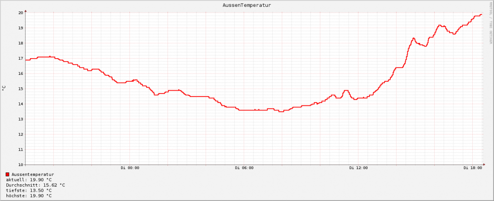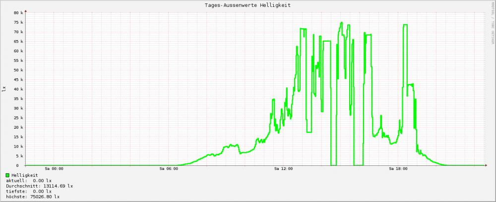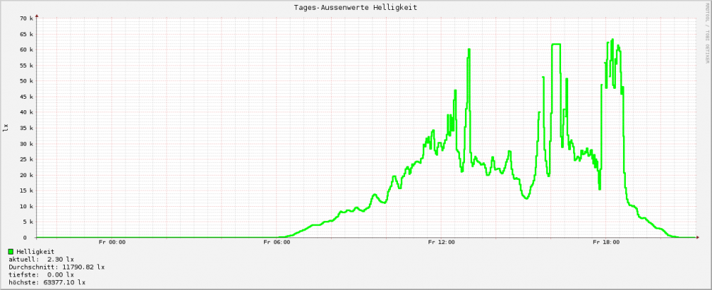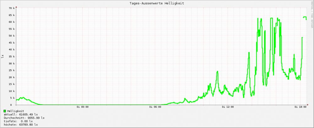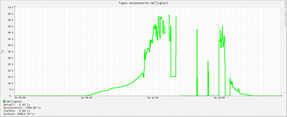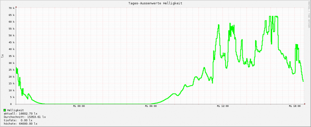 Hi, na jetzt aber: wie erhofft gab es im Graphen wieder Ausssetzer (siehe Anhang) Geschätzt hatte ich so ca. 15:30 Uhr für den Ersten - also ab ins Logfile uns siehe da: keine Fehlermeldungen oder irgendwelche "Ungewöhnlichkeiten". Beim genaueren Hinsehen wurde ich dann doch stutzig: wie sehen denn die Werte aus: um 15:32 Uhr hatte ich für 3 Minuten Werte von 66430 lx !?! Hier liegt also das Problem: Beim Ambient Light v1 konnte der Wert nicht größer als 800lx werden - daher bin ich bei der Version 2 auch davon ausgegangen (-> Datenblatt: bis 64000lx). Wie kreaktiv schon richtig angemerkt hat: ich habe natürlich als obersten Grenzwert 64000 beim Anlegen der RRD angegeben.... Die RoundRobin-Datenbank hat völlig richtig gearbeitet und Werte außerhalb dieser Grenze als Fehlerwert interpretiert und verworfen -> daher auch keine "Punkte" im Graphen. Ich werde den Wert jetzt mal auf 80000 erhöhen - die Aussetzer sind nun bestimmt weg .... Vielen, vielen Dank - ohne Euch würde ich immer noch im Trüben fischen. Aber woher diese hohen Werte ? Grüße aus dem Hochtaunuskreis, LPD -