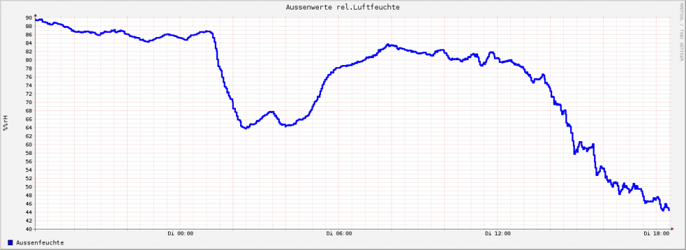 Hi, ... also den Rechtschreibfehler schliesse ich aus ! (die Log-Datei und der Graph waren wohl zu gross - daher fehlte der "rettende" Anhang ..) Jetzt aber: Ich hab meine RRD mit neuen Grenzen versehen (uG: 0.00lx, oG:100000lx) und mittels Logfile die Werte von gestern aufgezeichnet (und auf's Wesentliche gekürzt): Auffallend sind die Stellen, an denen Petrus das Sonnenlicht "ausgeknipst" hat (0 lx von 14:30 bis 14:45Uhr und 15:42 bis 16:11Uhr) und die maximalen Messwerte von 75026.8 lx um 15:01 bis 15:04 Uhr ... ... hier fehlt mir jede Erklärungsidee. aussenwerte29_08.lst -