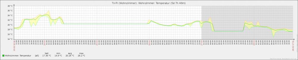 Hallo, ich habe ein Problem mit einem Temperature IR Bricklet. Die Temperatur bleibt regelmäßig stehen. Hab da einen Thread gefunden mit ähnlicher Problematik: http://www.tinkerunity.org/forum/index.php/topic,2406.msg18597.html#msg18597 Allerdings habe ich nur ein Humidity und ein Temperature-IR Bricklet am Brick angeschlossen. Eine Funksteckdose ist aber auch im Spiel, diese schalte ich jedoch mit der mitgelieferten Fernbedienung und nicht per Bricklet. Bisher kann ich keinen aber direkten Zusammenhang zwischen dem Schalten der Steckdose und dem Einfrieren des Thermometers feststellen. Geschaltet werden Verstärker, Fernseher, Horizon-Box etc. Es ist halt etwas ärgerlich, das die Temperatur sich einfach nicht mehr ändert. Alle API-Funktionen laufen ja noch ohne Fehlercodes.