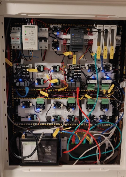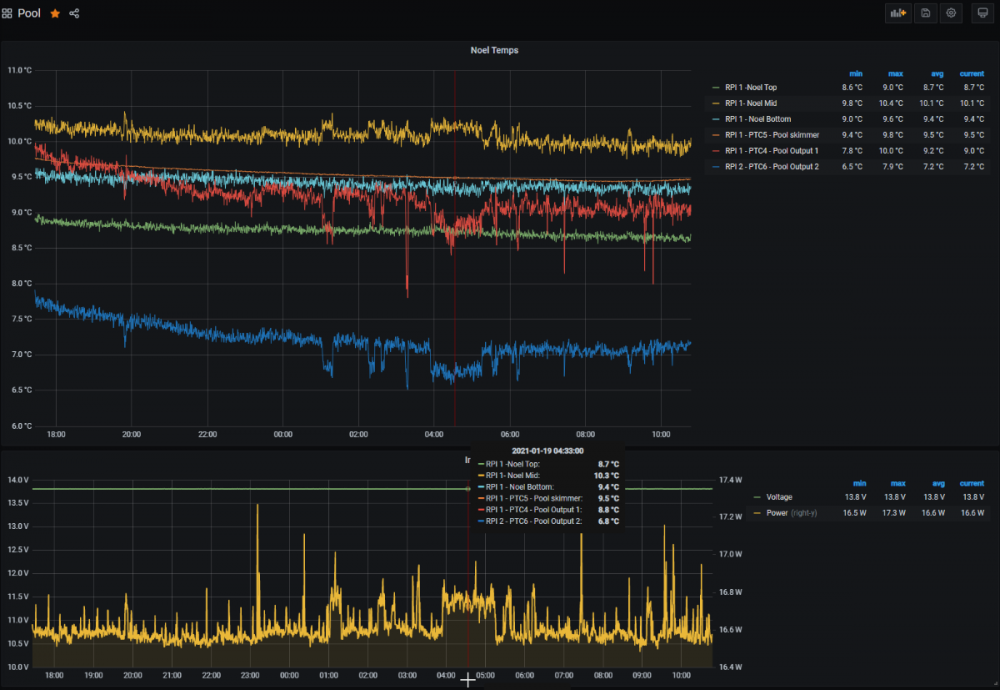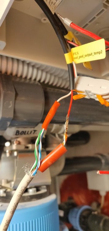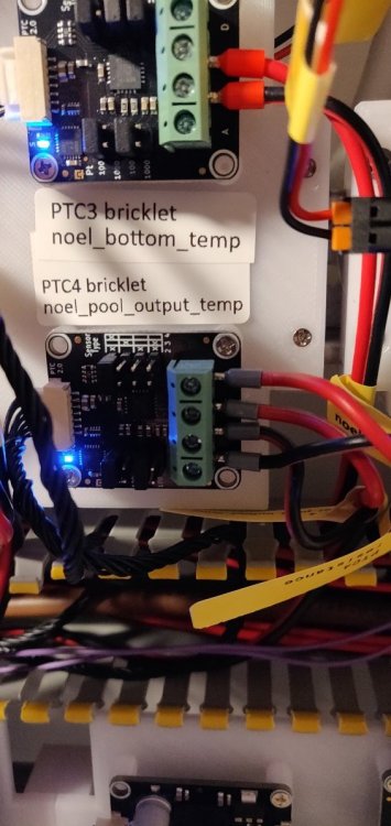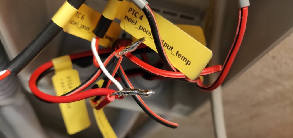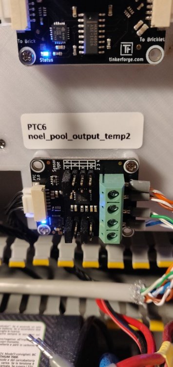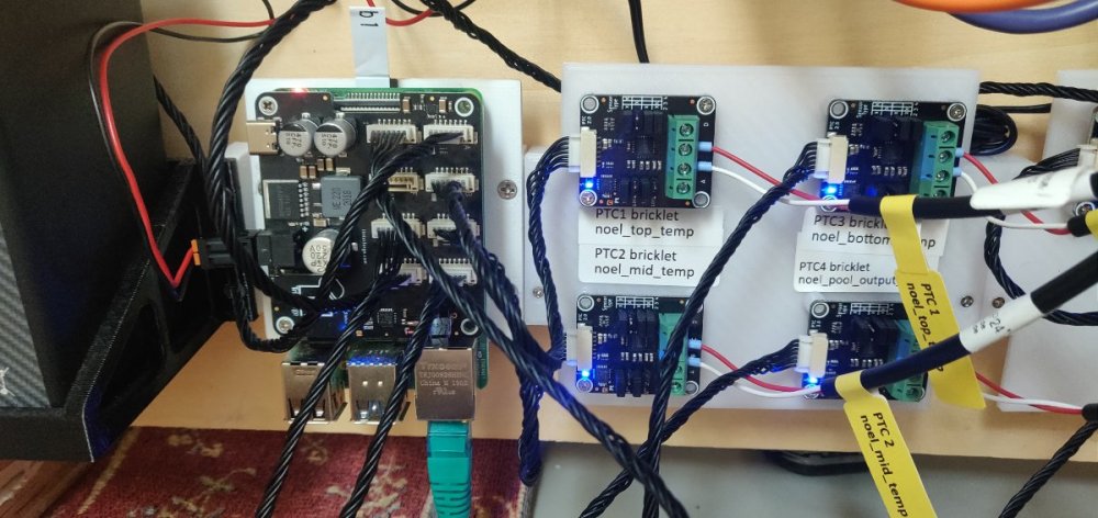 Hi, I have spent couple more days on testing the setup and rewiring and unfortunately still experience the problems. So I will share all the details and maybe with your external eye you will see something unusual in this one. I have changed a 4 x 0.75mm2 cable to one of the sensors and replaced it with shielded CAT6 ETH cable using 2 twisted pairs as single cable. I have also run that cable in a separate duct pipe on the celling away from all the power cable to the electrical cabinet. I have eliminated the WAGO style connector at the sensor end of the cable, and soldered the sensor cable to the extension cables. That did not have much of the influence on the output jitter. Here is a main view on my Tinkerforge automation cabinet. There are 2 RPI's with LARGE HATS that are my sensor hubs gathering all the data from bricklets with a python script service They are powered with 13.8V from the MeanWell PS that has battery backup. There are also 2 RPI's on the top in enclosures, that have OpenHab and Influx/Grafana completeing the setup. You can see in bottom left, a PTC5 proble connected the RPI 1 - that one is perfectly stable. Connected here for reference. Here are some of the connection closeups on the sensor cables that are the original one and the replaced cable for PTC6 All tightend well. The PTC 4 and 6 are set in the sooftware to the ptc6.set_wire_mode(4) On the sensor side. There is just a junction box with now soldered cables, as I removed the WAGO connectors already I focused my repair eforts on the pool output sensors PTC4 and PTC6 as those feed data to the 0-10V cotroled 3way Valve for precise temp control. The PTC1-3 in the NOEL heat storage tank are still extended with just 2 wire 0.75mm2 cable. So for the last day I see the following results. As you can see the PTC5 that is on 2 wires and directly to the brick is rock SOLID stable. One of the NOEL 2 wire long cable sensor is much better then other2 (Why?) Both PTC4 and 6 have huge problems with jitter and some additional spikes, that seem to corelate to the power use of the whole setup (that is measured by the isolated VC 2.0 Bricklet, that very much can also have a problem of accuracy) Basically that is a closed underground technical cavern and such a sudden changes in temp are completely impossible. No other electrical devices (like heatpums or pool pumps are switched on at that time) I'm running out of ideas what can I try to fix that. My last resort would be tring to add isolator bricklets to the PTC (makes any sense)? Adding RPI in the juncion box to measure The PTCs on a short cable (major rebuild). TIA for any sugestions Maciej -