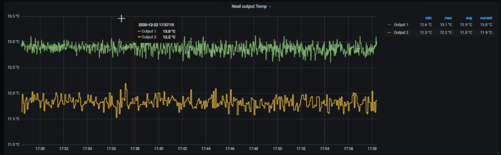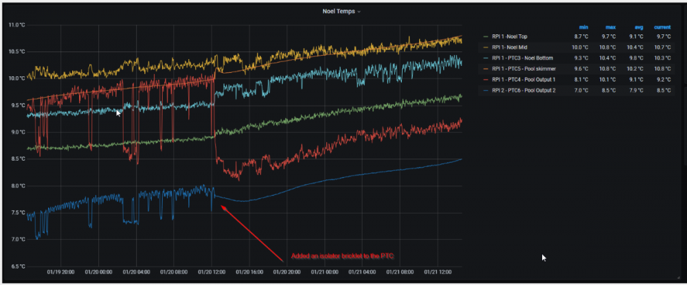 Ok so I rewired the setup and now 2 sensors (Output 1, Output2) are 4 wire (7m extension). 3 named Noel are old setup (2 wire 7m extension). And for comparison I added Poiol skimmer to the graph that is same PTC probe on 2 wire directly to PTC bricklet on the same RPI HAT. As you can see the extension is the problem , adding 2 wires did not improve the noise. Probe directly into the bricklet is super clean. What else could be a problem here? TIA -