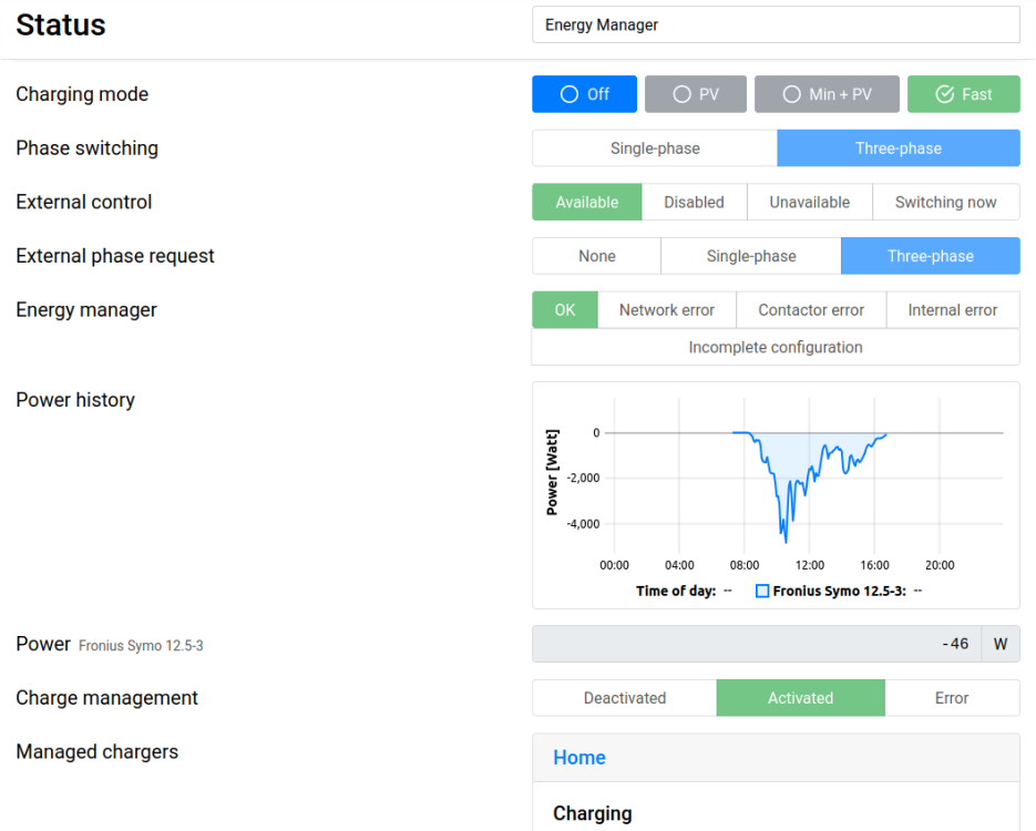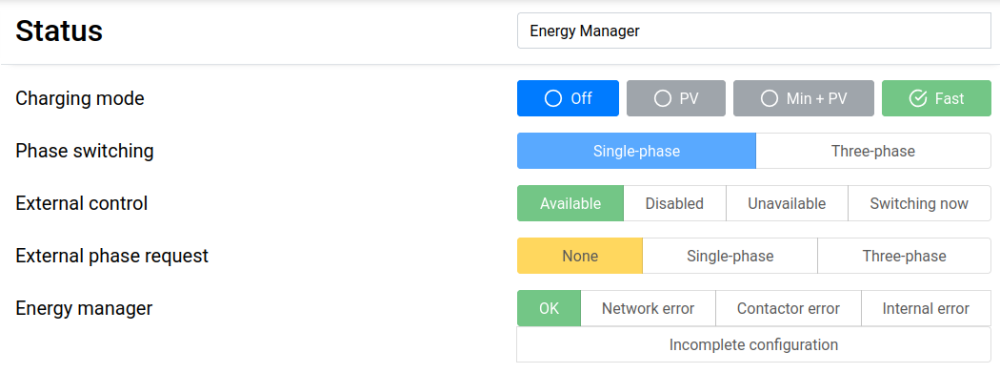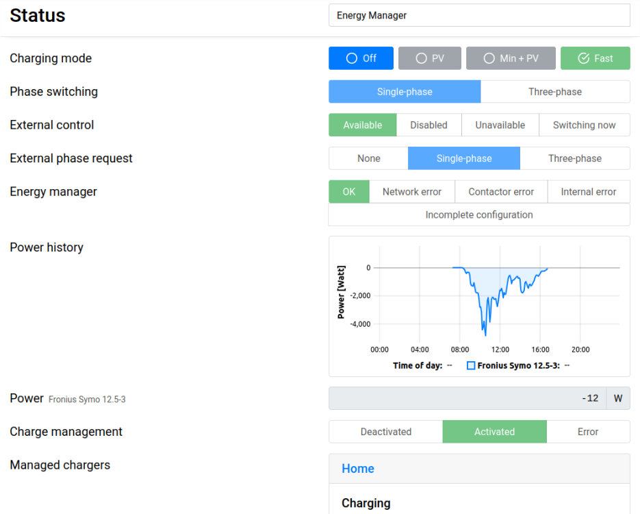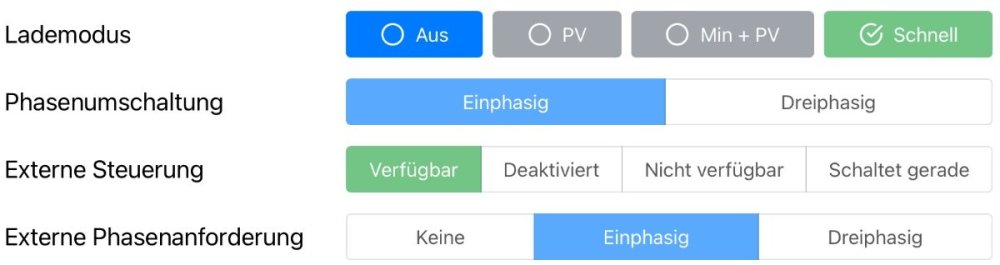 andyknownasabu Geschrieben February 5, 2024 at 18:36 Autor Geschrieben February 5, 2024 at 18:36 (bearbeitet) Jo, im EnergyManager von "EVCC/external control" auf z.B. "dauerhaft 1-Phasig laden" umstellen und er fängt innerhalb von zwei Minuten an zu laden. Problemlos. @MatzeTF Update: Das ist interessant: Lademodus ist der in EVCC eingestellte (bei mir initial "fast") und ich kann dort auf z.B. "min+PV" umstellen und er regelt automatisch die Leistung runter. Ich weiß nicht, wie in diesem Fall (EM: single-phase, Charger: external control) die Kommunikation zwischen EVCC/EM/Charger funktioniert, aber direkte Steuerung des Chargers (?) über EVCC unter Umgehung des EM (?) funktioniert offensichtlich noch. bearbeitet February 5, 2024 at 21:13 von andyknownasabu Zitieren