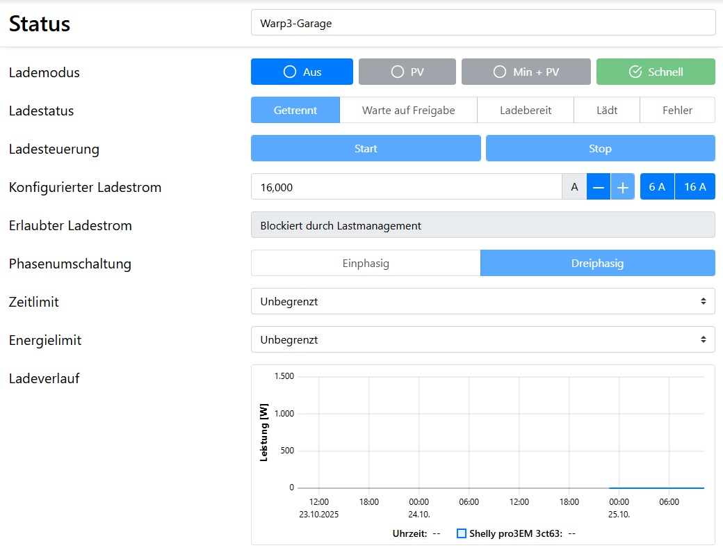 MatzeTF Geschrieben October 25, 2025 at 10:56 Geschrieben October 25, 2025 at 10:56 On 10/25/2025 at 10:29 AM, meierchen006 said: ich hole mein E-Auto beim Händler ab dieses wird nicht Vollgeladen sein, wären ja Kosten Elektroautos werden dem Kunden in der Regel vollgeladen übergeben. Das kostet den Händler fast nichts und würde sonst bei der feierlichen Übergabe schlecht aussehen. Quote Meine Einstellungen und die Frage ob diese richtig sind: Sieht alles richtig aus. Einfach einstecken und laden. Übrigens verhält sich die Wallbox ohne angeschlossenes Auto manchmal nicht so, wie man das anfangs erwarten würde. Der Hinweis „Blockiert durch Lastmanagement“ hat schon manch einen Nutzer ohne Auto verwirrt. Warte einfach ab, bis dein Auto da ist, und melde dich wieder, falls dann wider Erwarten irgendwas nicht funktionieren sollte. Quote es ist aber ein Stromzähler im Zählerschrank eingebaut nur für die Wallbox, und auch als Stromzähler konfiguriert !? siehe auch erster Beitrag oben. Die Überschrift ist „Hardware-Konfiguration“, womit die Wallbox-Hardware gemeint ist. Deine Wallbox hat keinen Stromzähler eingebaut, also ist auch keiner intern angeschlossen. Der Stromzähler im Zählerschrank ist nicht an die Wallbox angeschlossen, sondern wird übers Netzwerk abgefragt. 1 Zitieren
