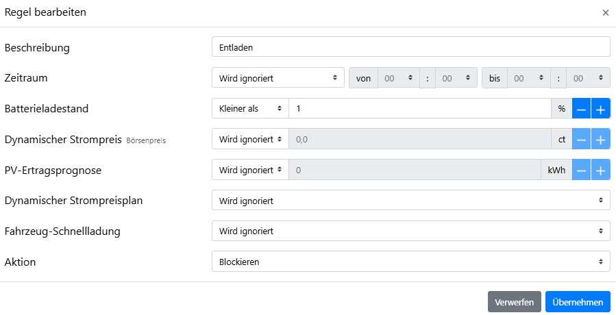 Geschrieben December 23, 2025 at 19:4823. Dez 2025 Du legst einfach keine Regel fürs Entladen an. Dann wird das Entladen immer dem Wechselrichter überlassen.Die Regeln sind schließlich dazu da, in bestimmten Situationen den Speicher zu beeinflussen, und nicht den Normalfall vorzugeben. Trifft keine der Regeln zu, ist ja auch der Normalmodus aktiv und nicht einfach „nichts“.