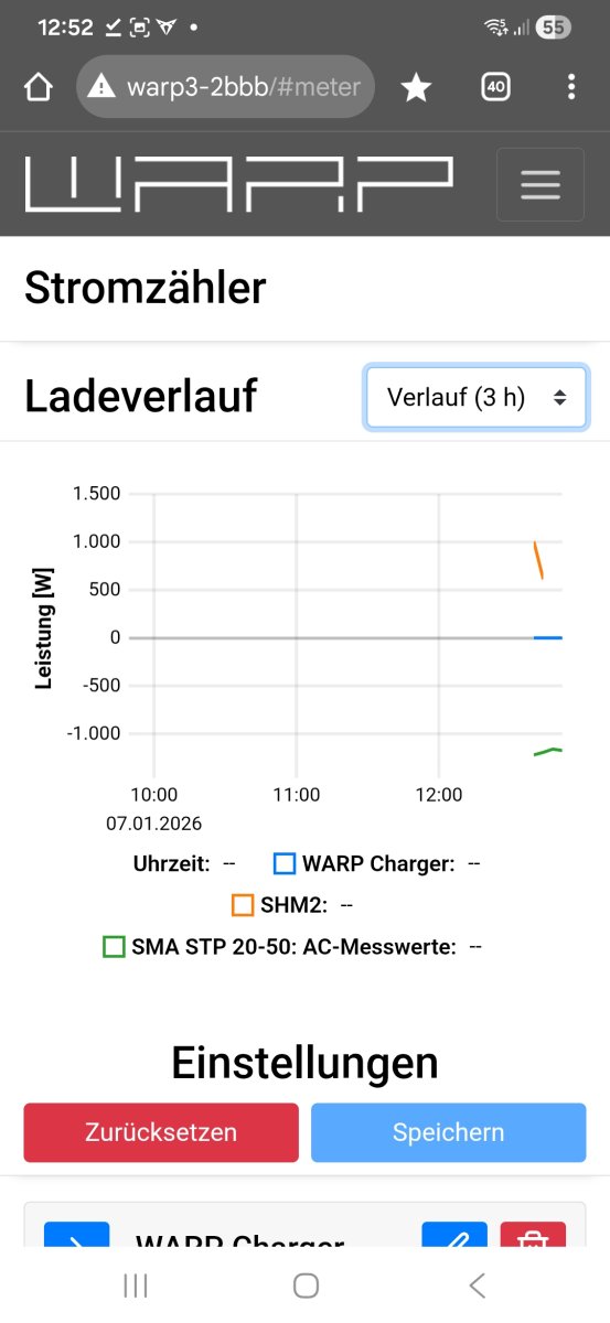 Geschrieben January 7, 2026 at 12:407. Jan 2026 Autor Hi Matze,vielen lieben Dank fürs schnelle Reinschauen! Dann war das Lastmanagement offenbar in Aktion.Nur um sicherzugehen, dass ich alles richtig konfiguriert habe, und doch kein Bug vorhanden ist:Bei mir zieht auf Phase 2 aktuell die Wärmepumpe mit ca. 10A. Dazu kam der Herd, den meine Frau zu dem Zeitpunkt einschaltete, mutmaßlich mit nicht mehr als 16A (eher weniger auf dieser Phase). Dann hätten wir immer noch 9A übrig für die Warp, bis die eingestellten 35A pro Phase am Hausanschluss überschritten sind.Meine Fragen zur Plausibilitätsprüfung: Wurde vorher bereits die Ladeleistung reduziert, oder lief das bis zur Abschaltung auf konstant 16A pro Phase weiter? Was mich stutzig macht: Wieso zeigt die Meldung im Screenshot in meinem ersten Beitrag eine Überschreibung von über 15000 mA an? Wenn, dann dürfte doch nur um wenige A überschritten worden sein.Kannst du ggf. die Kurven aus meinem Log einmal posten? Durch Neustart der Warp nach dem Update der Firmware sind die bei mir nicht mehr verfügbar.Falls das alles passt, dann hat das Lastmanagement in diesem Fall ja exakt so funktioniert, wie es sollte. Dann ein großes Daumen hoch, Lasttest bestanden :-)Die Testfirmware werde ich installieren. bearbeitet January 7, 2026 at 12:407. Jan 2026 von nagi